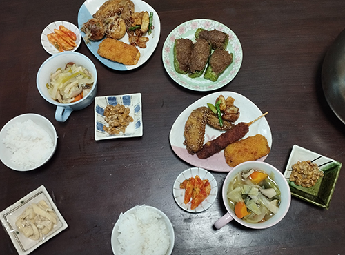 2022-10-5 2022/10/5 夕飯 野菜スープ、トマトソースペンネ、納豆、味噌串カツ、マグロカツ、たこ焼き、手羽揚、ゴボウとにんにくの目炒め、ピーマンの肉詰め、白飯。今日は全般的に半額惣菜が主力(笑)