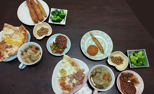 野菜スープ、ミニメンチ、シシャモフライ、エビフライ、コロッケ、根菜と鶏肉和え、納豆、茹ブロッコリー、ピザ。手作り品が極端に少ないな~(笑)
