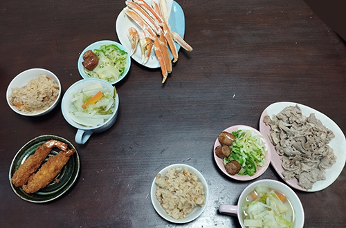 野菜スープ、ピーマンとキャベツ+ハーブウィンナーソテー、茹蟹、豚しゃぶ、エビフライ、炊き込みごはん。正月食材を今更使ってみる(笑)