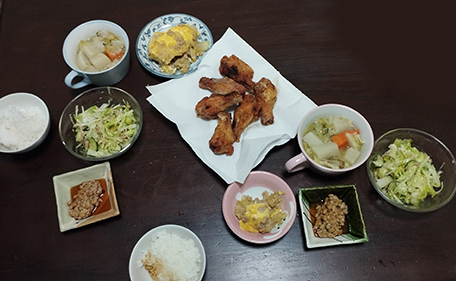 野菜スープ、豚肉と玉葱の卵とじ、レタス胡瓜ツナサラダ、納豆、鶏手羽揚、白飯。オムレツ化大失敗(笑)