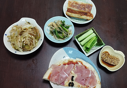 キャベツと玉葱の炒め、にらもやし炒め、胡瓜、納豆、春巻、生ハムのせピザ。ある食材品と安く買ったものをあんまり覚えてなくて組み合わせてカオス(笑)
