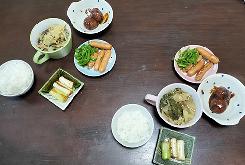 野菜スープ、焼葱、甘酢肉団子、ウィンナーとピーマンソテー、白飯。手抜き度合いがどんどんひどくなってる(笑)