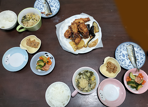 野菜スープ、納豆、ズッキーニとベーコンと人参のソテー、鰯丸干、鶏手羽揚、素揚げ茄子じゃが芋、白飯。素材を楽しむ手抜き献立が多め(笑)