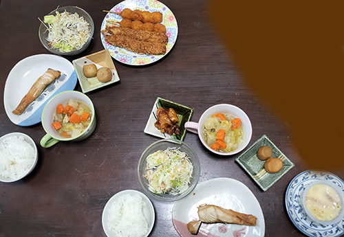 野菜スープ、焼鮭、里芋煮、カット野菜サラダ、うずら卵フライ、エビフライ、グラタン、鶏甘辛揚、白飯。調理割合超少な目(笑)
