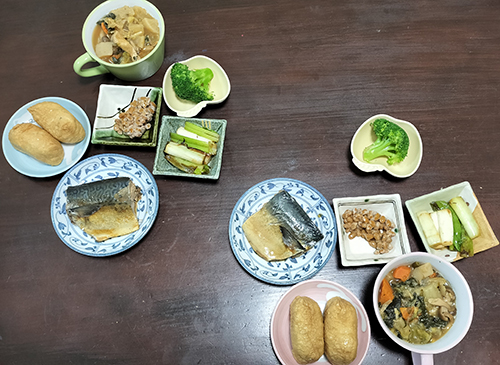 野菜スープ、焼葱、焼鯖、、茹でブロッコリー、納豆、稲荷寿司。焼き物系だけ頑張った?(笑)