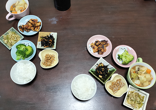 野菜スープ、野菜炒め、ひじき煮、茹でブロッコリー、鶏肉甘辛炒め、納豆、白飯。ほぼ昨日がデジャブする(笑)