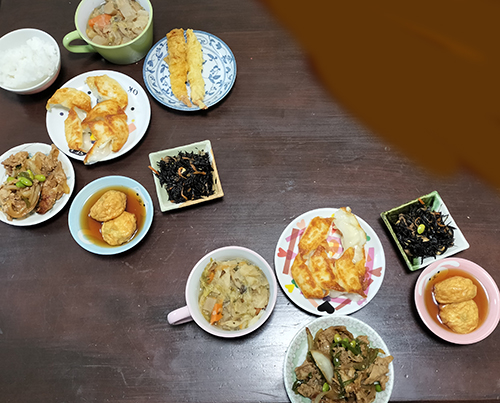 野菜スープ、ひじき煮、豆腐揚げおひたし、チーズ餃子?、海老天、肉野菜炒め、白飯。子供のウケ悪いメニューをあえて出してみた(笑)