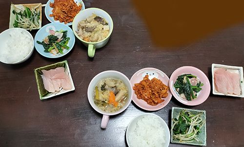 野菜スープ、豚キムチ、ベーコンとほうれん草ソテー、にらもやし炒め、鮪刺身、白飯。炒め系で攻めあぐねる(笑)
