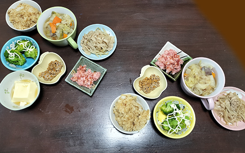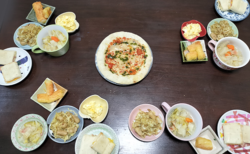 2024-1-4 2024/1/4 夕飯 野菜スープ、マルゲリータピザ、キャベツとウィンナーの炒め、玉子サラダ、チーズ春巻、ロールピザ。正月三が日は恐ろしくて載せられない、、、そして今日も夕飯にしてはギリのレベル(笑)