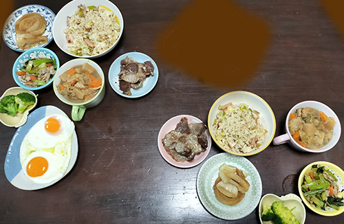 肉野菜炒め、茹でブロッコリー、イベリコ豚ソテー、玉葱ソテー、目玉焼き、チャーハン。ちょっとやっつけ感あり?(笑)