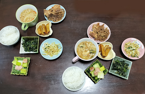 味噌汁、野菜炒め、ほうれん草おひたし、鶏唐揚、レンコン素揚、ネギとウィンナーソテー、大学芋、白飯。割と野菜類で満たしたつもり(笑)