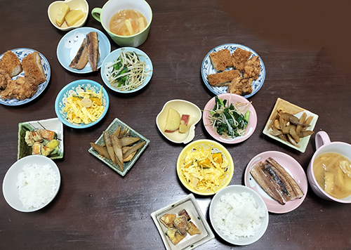 味噌汁、ニラもやし炒め、南瓜と野菜のサラダ、秋刀魚、鶏牛蒡、薩摩芋煮、鶏唐揚、豚カツ、揚南瓜、白飯。頼りない一品が多めの献立(笑)