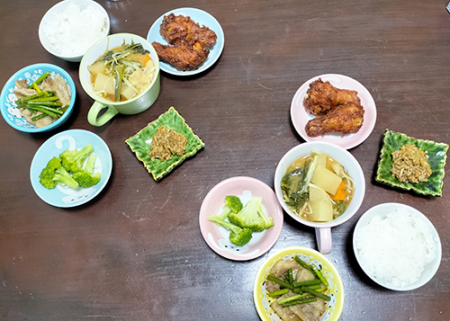 味噌汁、茹でブロッコリー、納豆、鶏唐揚、にんにくの芽と豚肉炒め、白飯。手間がそんなにかかっていないところがいやはや、、(笑)