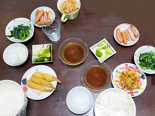 味噌汁、茹でブロッコリー、茹でほうれん草、海老天、野菜かき揚げ、ウィンナーソテー、白飯。献立に本当に困った日(笑)