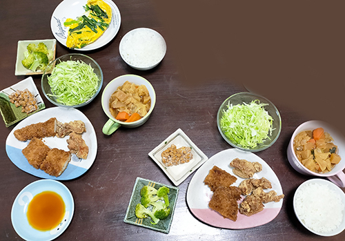 味噌汁、茹でブロッコリー、千切りキャベツ、納豆、ニラ玉、鶏唐揚、ヒレカツ、白飯。メインはあっためで簡単に(笑)