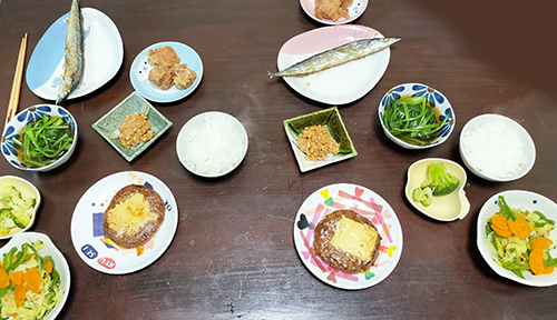 茹でブロッコリー、野菜炒め、ほうれん草おひたし、焼秋刀魚、鶏唐揚、納豆、チーズハンバーグ、白飯。子供が大体好きな味(笑)