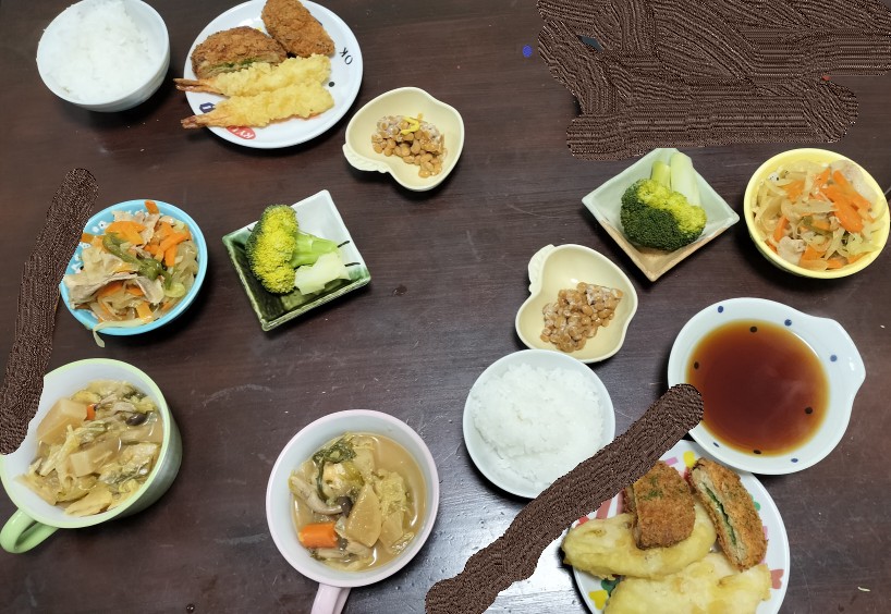 2024-12-2 2024/12/2 夕飯 味噌汁、梅紫蘇チキンカツ、蓮根天、海老天、茹でブロッコリー、肉野菜炒め、白飯。香ばしい焦がし豚角煮に黒コショウ香るポテサラ、パリッと蓮根チップスがアクセント。梅紫蘇チキンカツの爽やかさが主役を張り、天ぷらの香ばしさと肉野菜炒めの旨味が脇を固める、味噌汁と白飯が優しく受け止める、バランスと満足感のそろった和のごちそう膳。(笑)