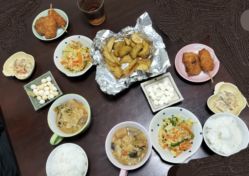2024-12-3 2024/12/3 夕飯 味噌汁、肉野菜炒め、ポテトフライ、ポテサラ、パールモッツァレラ、串カツ、チキンカツ、白飯。ボリューム満点で満足感◎!ガッツリ系にポテサラやモッツァレラのちょいオシャレ感が効いてて、食べてて飽きない絶妙バランス!(笑)