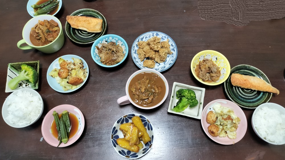 味噌汁、鮭竜田揚、鶏肉団子とキャベツ炒め、茹でブロッコリー、大学芋、鶏唐揚、おくら煮びたし、牛すき煮、白飯。今日は味噌汁とごはんを中心に、品数多めでしっかり作ってみた。