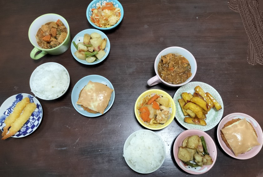味噌汁、チーズのせメンチ、海老天、大学芋、肉野菜炒め、ジャーマンポテト、白飯。今日は味噌汁とごはんを土台に、揚げ物多めでしっかりめの献立に。