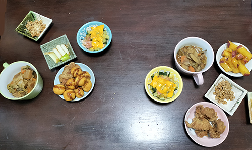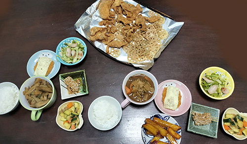 2024-10-10 2024/10/10 夕飯 味噌汁、ズッキーニと人参とツナソテー、ハーブウインナーと野菜炒め、チーズのせコロッケ、納豆、鶏皮揚と蓮根揚、大学芋、白飯。シンプルに身体に差し障りありそうな気が(笑)