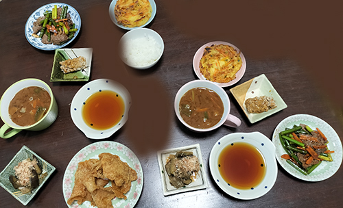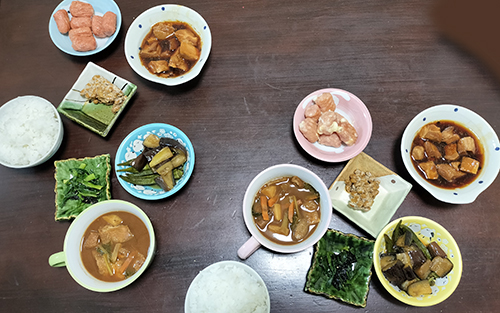 味噌汁、角煮、ほうれん草和え物、チーズウィンナー、茄子とオクラの煮物、白飯。珍しく揚げ物抜きだけど、、(笑)