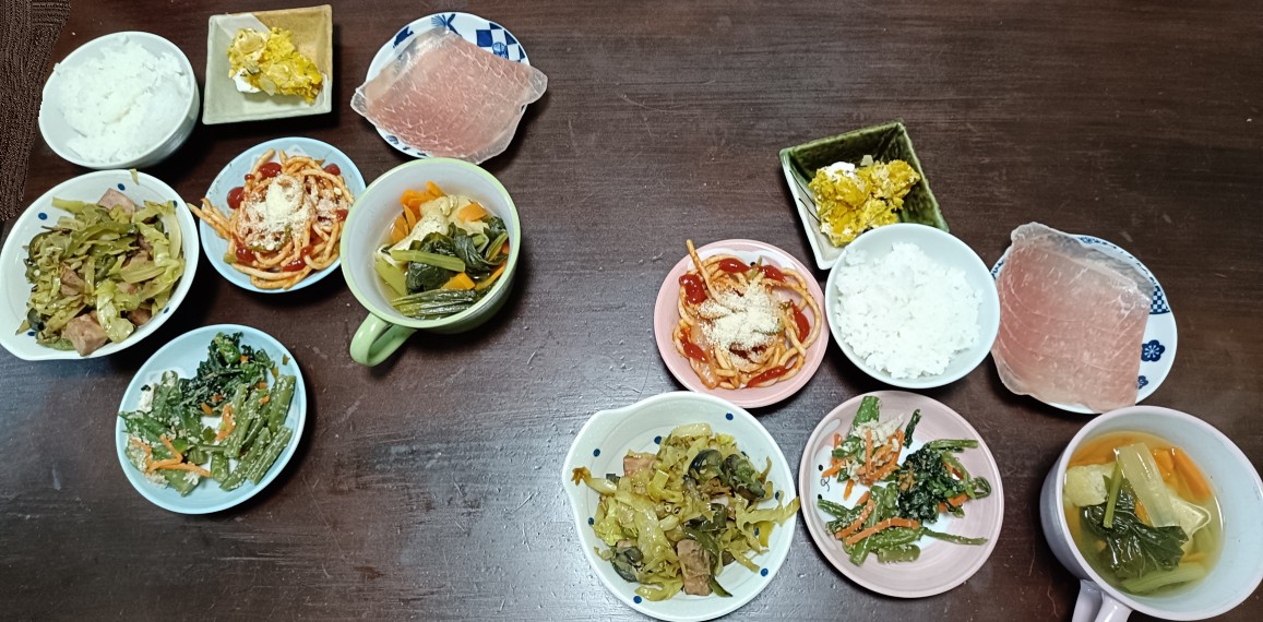 野菜スープ、ハムとキャベツとピーマンの炒め、生ハム、トマトパスタサラダ、南瓜サラダ、ほうれん草の胡麻和え、白飯。昨日とあまり変わらないラインナップだけど、スープを替えたりお惣菜を足したりするだけで、少しずつ違う食卓に見えるから不思議。全部を手作りするわけじゃないけど、白飯を中心に並べるとそれなりに落ち着く。毎日のことだから、気楽に続けられるのがいちばん。。(笑)