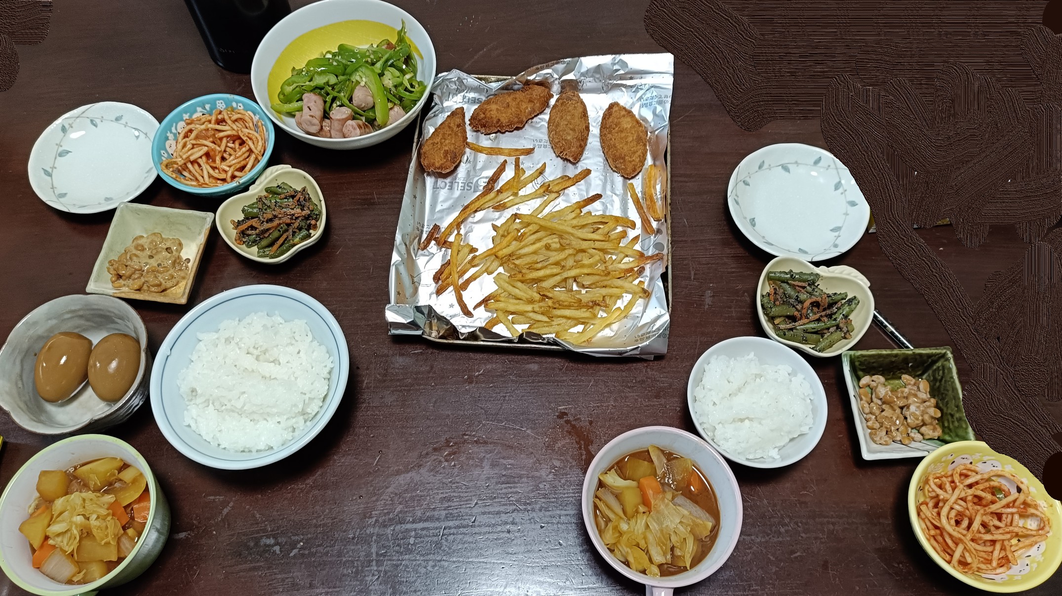 ピーマンの香りとナポリタンのケチャップが妙に仲良く、フライドポテトがそのあいだをうろうろしている。味噌汁と納豆が最後の砦のように“和の顔”を保ってくれているのもありがたい。
